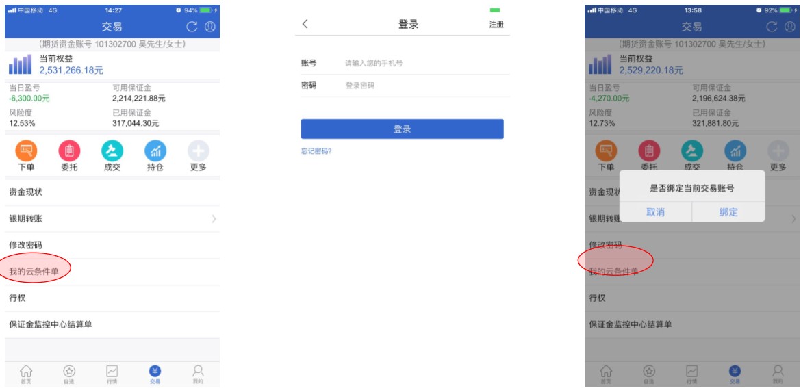 “中原期货-中原红”APP条件单及止损止盈单需绑定手机号码注册云账号,认证登陆后使用。