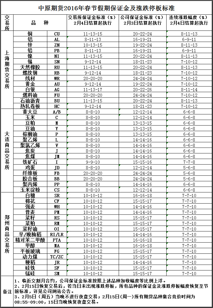 2016年春节假期临近(2016年2月6日至2月14日休市,15日恢复交易),为了有效控制假期期间交易风险,防止假期间因国际市场相关品种价格波动对国内期货品种产生影响,各商品交易所调整了部分品种交易保证金及涨跌停板幅度标准,我公司自2月3日结算时起对商品期货客户交易保证金浮动比例也进行了相应调整,中国金融期货交易所各品种交易保证金及涨跌停板幅度不变,详情见下表或登陆公司网站查询。