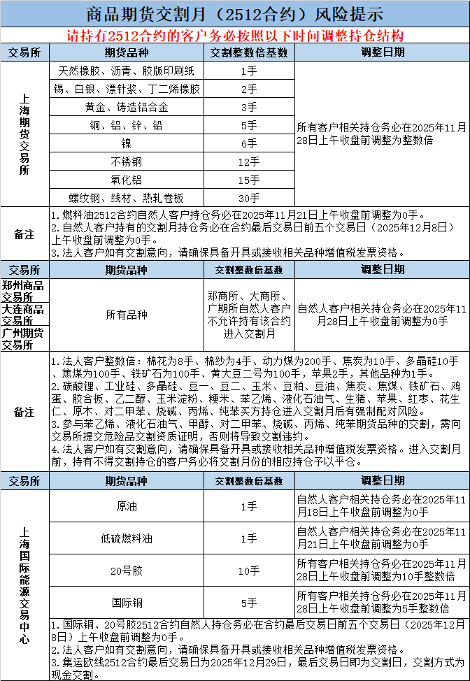 尊敬的客户:本月最后交易日为11月28日,如您持有商品期货2512合约,(燃料油、原油、低硫燃料油合约除外)请务必在11月28日上午收盘前按交易规则调整持仓结构,具体规则详见下表。我司将于11月28日下午开盘后对违规持仓进行处理,感谢您的配合!