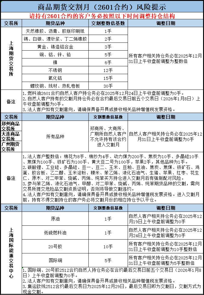 尊敬的客户:本月最后交易日为12月31日,如您持有商品期货2601合约,(燃料油、原油、低硫燃料油合约除外)请务必在12月31日上午收盘前按交易规则调整持仓结构,具体规则详见下表。我司将于12月31日下午开盘后对违规持仓进行处理,感谢您的配合!