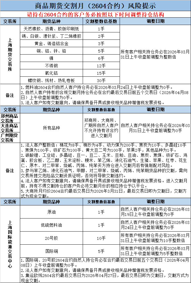 尊敬的客户:本月最后交易日为03月31日,如您持有商品期货2604合约(燃料油、原油、低硫燃料油合约除外),请务必在03月31日上午收盘前按交易规则调整持仓结构,具体规则详见下表。我司将于03月31日下午开盘后对违规持仓进行处理,感谢您的配合!